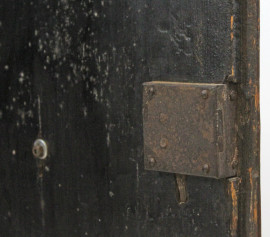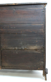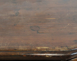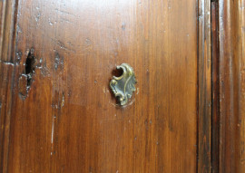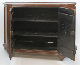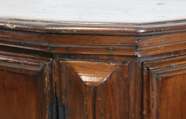 Credenza scantonata in noce, XVIII-XIX secolo, fronte a due sportelli e due ripiani interni, arte povera, cm h 104x143x42,5, (difetti e segni del tempo).