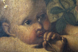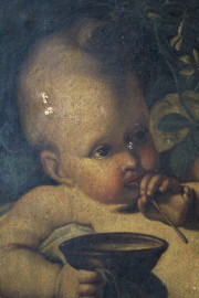 Da Ignazio Stern (1679-1748), Vanitas con putto e bolle di sapone, olio su tela, cm 48x59, XIX secolo, entro cornice, (difetti alla tela).