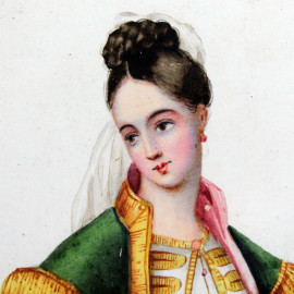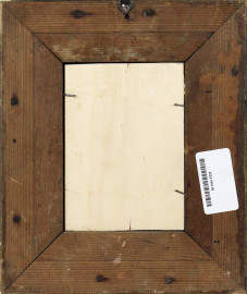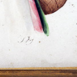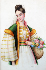 Fanciulla con cesta di fiori, acquarello su carta, cm 13,5x9, firmato, entro cornice.