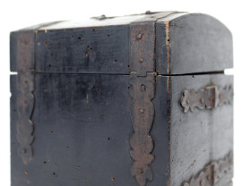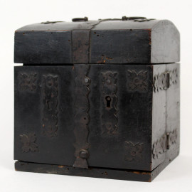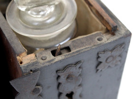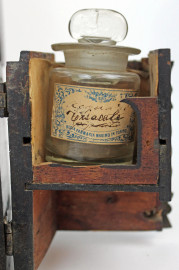 Farmacia da viaggio, cofanetto in legno ebanizzato con applicazioni in ferro, apribile e celante all'interno cassettini e scomparti contenenti flaconi in vetro e metallo, XIX secolo, cm h 17x16x16, (difetti).