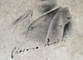 Foto alla gelatina ai sali d’argento raffigurante Giacomo Puccini con firma autografa del compositore, cm 10x14, entro cornice