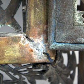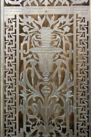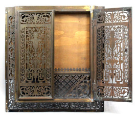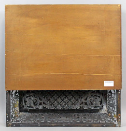 Fronte di camino a due sportelli in ghisa e metallo con decori floreali e geometrici, pannello retrostante in legno, cm 72,5x69, XIX secolo, (difetti).