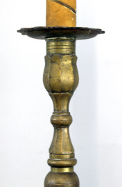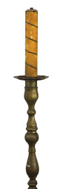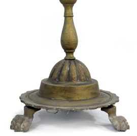 Lampada da terra in metallo dorato, fusto tornito sostenuto da base circolare poggiante su tre zampe ferine, cm h 149, XX secolo, (segni del tempo).