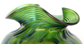 Loetz, vaso in vetro verde, cm h 12, diam. cm 17, inizi XX secolo.