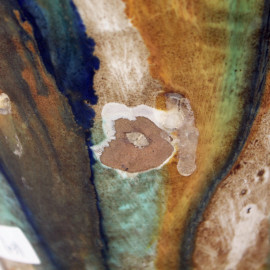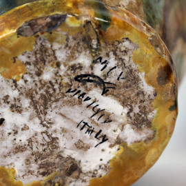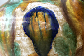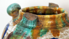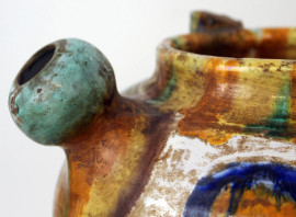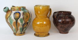 Lotto composto da due versatoi ed un vaso biansato in ceramica smaltata policroma, altezza max cm 35,5, manifatture ed epoche diverse, (difetti e mancanze).