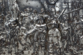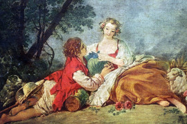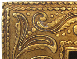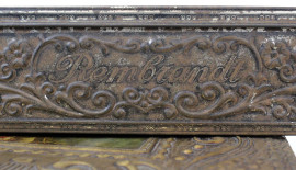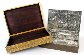 Lotto composto da un cofanetto portabiscotti in metallo sbalzato ed una scatola in legno dorato ed intagliato con stampa raffigurante "La Marotte" da Francois Boucher, misure max cm h 7,5x25x35, metà XX secolo, (difetti).