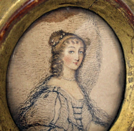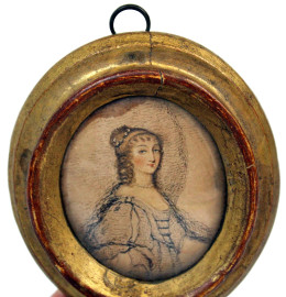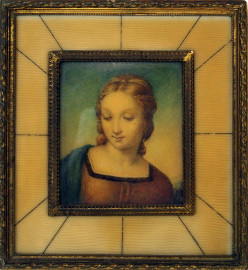 Lotto composto da una tecnica mista raffigurante ritratto di Lady Anne Gordon e due piccole stampe raffiguranti Pietro Verri e la Madonna del Cardellino da Raffaello, misure max cm 8,5x6, XIX-XX secolo, entro cornici, (macchie).