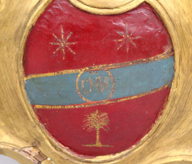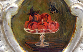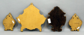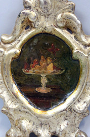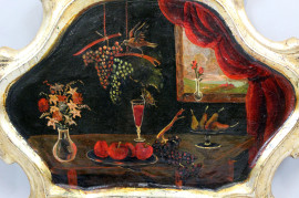 Lotto composto da uno stemma e tre cartaglorie in legno intagliato e dorato raffiguranti una tavola imbandita e nature morte, olio su tavola, misure max cm 39x39, epoche diverse, (difetti).