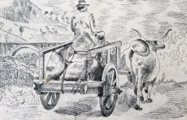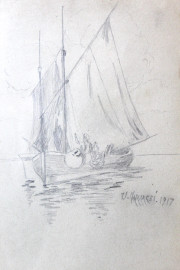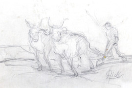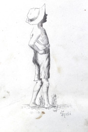 Lotto di cinque disegni su carta raffiguranti veliero, fanciullo, carri con buoi e uomo assorto, misure max cm 22x15,5, firmati, entro un'unica cornice, (ingombro totale cm 41,5x58,5), (difetti).