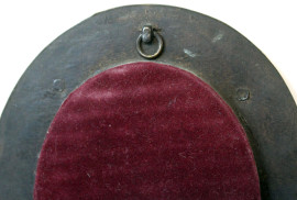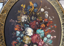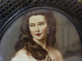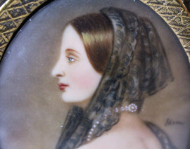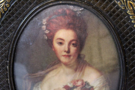 Lotto di due coppie di miniature ad assetto ovale raffiguranti ritratti di nobildonne e fiori, composto da due stampe a colori ed un olio su tavola, misure max cm 11,5x9, XX secolo, entro cornici in metallo.