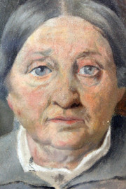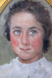 Lotto di due ritratti raffiguranti donna anziana e bambina, olio su cartone, misure max cm 21x16, ad assetto ovale, XX secolo, entro cornici