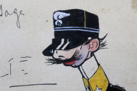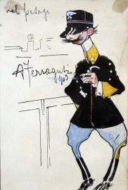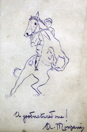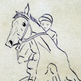Lotto di due tecniche miste su carta raffiguranti caricatura di ufficiale nel pesage e fantino a cavallo, misure max cm 18,5x11,7, firmati, entro cornici, (macchie).
