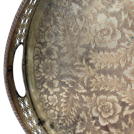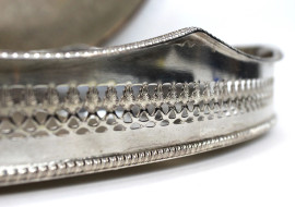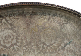 Lotto di due vassoi in metallo argentato, di linea ovale con decori floreali incisi, profili traforati e cesellati, misure max cm 6x40,5x61, XX secolo, (difetti).