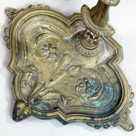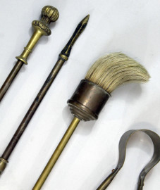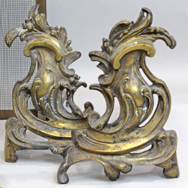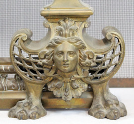 Composto da: un parascintille di linea sagomata con rete in bronzo, una base porta-accessori, una pinza, una paletta, uno scopino, un soffietto, una coppia di alari ed un ferma braciere traforato e decorato con teste femminili, leonine e mascheroni, poggiante su quattro zampe ferine.