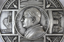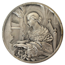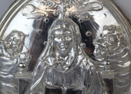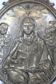 Lotto di quattro oggetti in metallo argentato, composto da due medaglioni da ostensorio raffiguranti Madonna con libro ed angeli e due spille raffiguranti Santa che suona l'organo e Papa Pio XI, misure max cm 12,5x16, inizi XX secolo, (difetti).