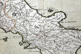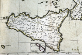 Lotto di sei stampe raffiguranti la Sicilia, la Corsica, parte del Regno di Napoli, il Golfo di Venezia, il Golfo di Genova e la costa del nord Africa, cm 28,5x46, XVIII secolo, (difetti e restauri al vetro).