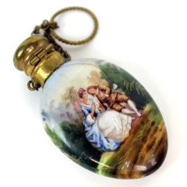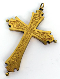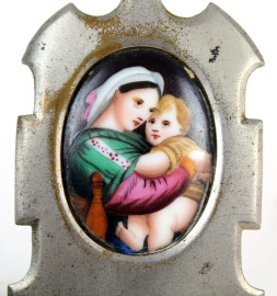 Lotto di tre oggetti diversi, composto da una croce in metallo dorato, una placca ed un portaprofumo in porcellana policroma raffiguranti Vergine con Bambino e scena cortese, misure max cm 9,5x7, epoche diverse, (difetti).