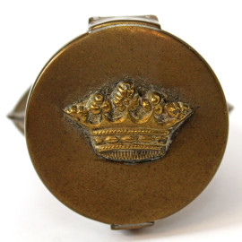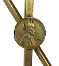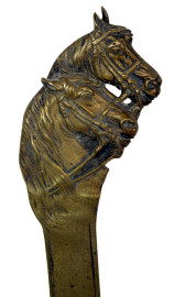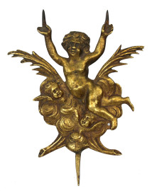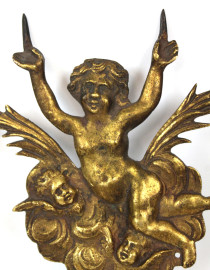 Lotto di vari oggetti in metallo dorato, composto da una paletta da torta, un appendiabiti con moneta, un tagliacarte, una scultura di putto con cherubini e due scatoline, lunghezza max cm 31, epoche diverse, (difetti e mancanze).