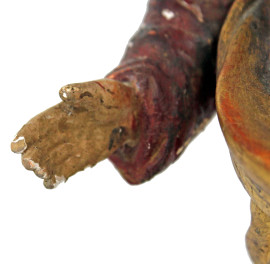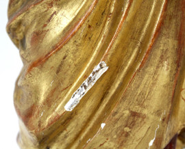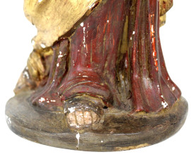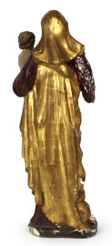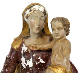 Madonna con bambino, scultura in legno intagliato, dorato e dipinto, cm h 47, XIX secolo, (difetti).