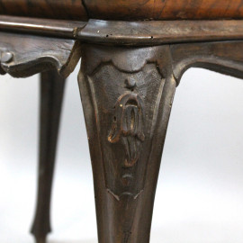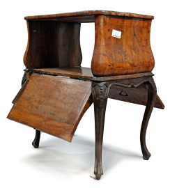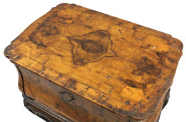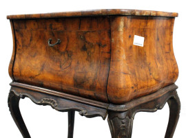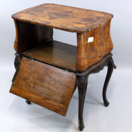 Mobiletto da centro in noce e radica con laterali a due sportelli a ribalta, particolari intagliati, cm h 77x66x45.