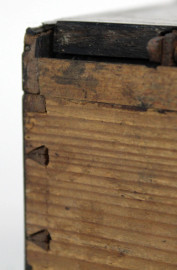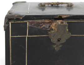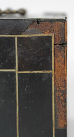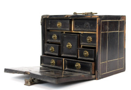 Modellino di monetiere in legno ebanizzato, XIX secolo, sportello frontale a ribalta celante nove cassettini all'interno, cm h 10x12,5x8,5, (difetti e mancanze).