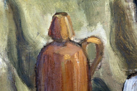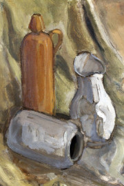 Natura morta, brocche e vasellame, olio su tavola, cm 40x30, XX secolo, entro cornice