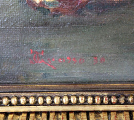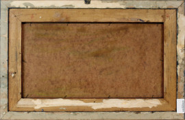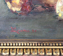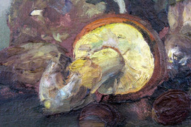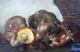Natura morta con funghi, olio su cartone, cm 30x56, firmato,entro cornice.