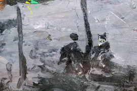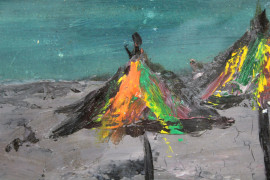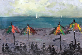 Ombrelloni, olio su cartone, cm 29x38, XX secolo, entro cornice.