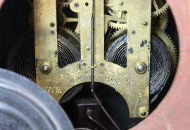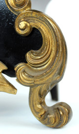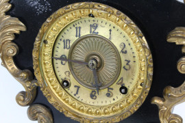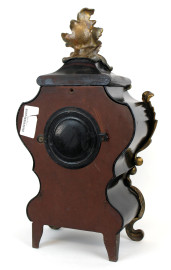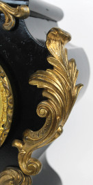 Orologio da camino, Francia, XIX secolo, in legno laccato e metallo, quadrante a numeri arabi e dettagli fogliacei in bronzo dorato, cm h 46, (meccanismo da revisionare).