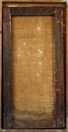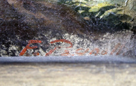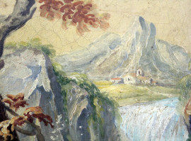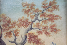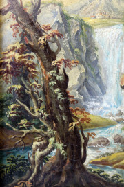 Paesaggio con alberi e cascata, olio su tela, cm 51x24, firmato, entro cornice.