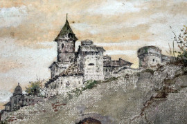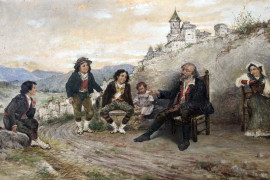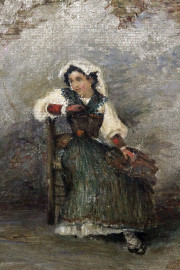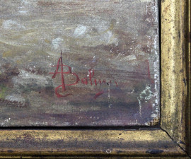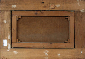 Paesaggio con strada e gruppo di figure a riposo, olio su tela, cm 30x52, firmato, entro cornice, (piccole cadute di colore).
