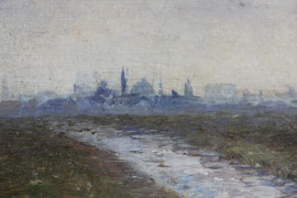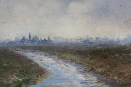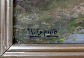 Paesaggio orientale, olio su tela riportata su cartone, cm 23x30, firmato, entro cornice.