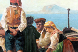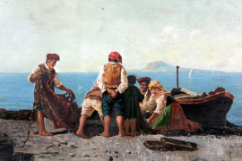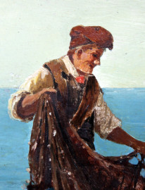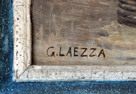 Pescatori in spiaggia, olio su tavola, cm 57x23, firmato G.Laezza, entro cornice.