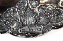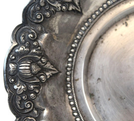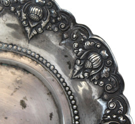 Piattino di linea tonda centinata in argento sbalzato e cesellato a decoro di fiori, diam. cm 20, gr. 210