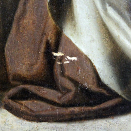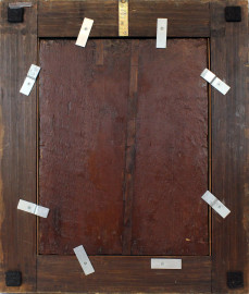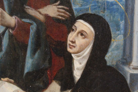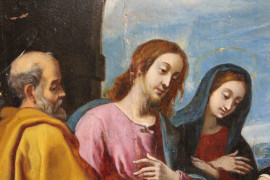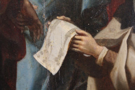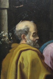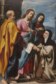 Pittore del XVI secolo, Santa Caterina da Siena con Cristo, la Vergine e San Giuseppe, olio su tavola, cm 44x34, entro cornice, (difetti).
