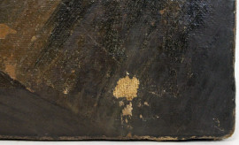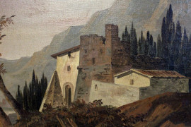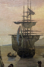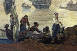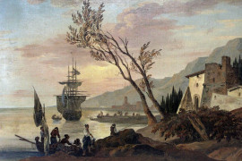 Pittore nordico del XIX secolo, Costa con veliero e figure, olio su tela, cm 54,5x73, (piccole cadute di colore).