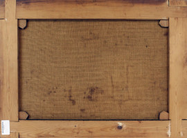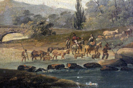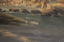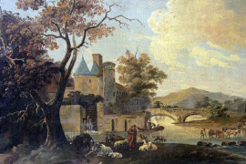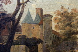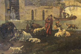 Pittore nordico del XIX secolo, Paesaggio fluviale con castello, figure ed armenti, olio su tela, cm 54,5x73, entro cornice.