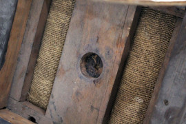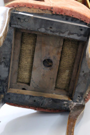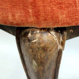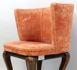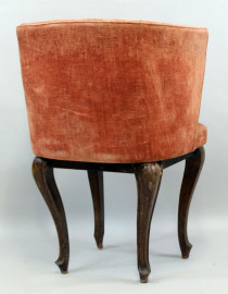 Poltroncina a pozzetto in noce, XIX secolo, seduta e schienale rivestiti in velluto rosa salmone, gambe mosse, cm h 76,5, (difetti).
