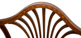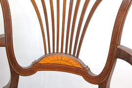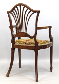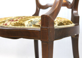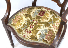 Poltroncina inglese modello Sheraton in mogano, XIX secolo, con filettatura ed intarsi in vari legni, seduta in stoffa fiorata, cm h 95, (segni del tempo)