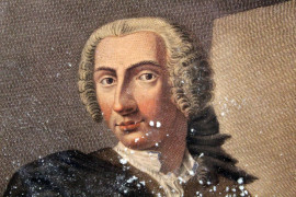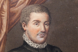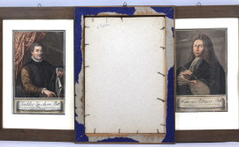 Quattro incisioni acquerellate raffiguranti ritratti di celebri pittori, cm 28x17,5, inizi XIX secolo, entro cornici, (lievi difetti e macchie).