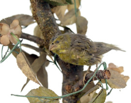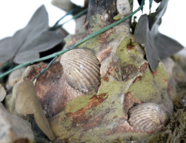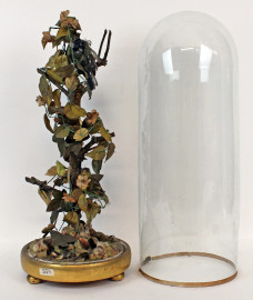 Ramo d'albero con uccellini, foglie e conchiglie in materiali diversi entro campana in vetro, poggiante su base circolare, cm h 43,5, (altezza teca cm 47,5, altezza base cm 5,5), (difetti).