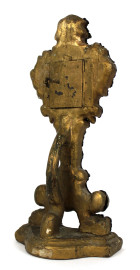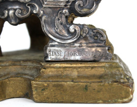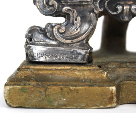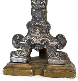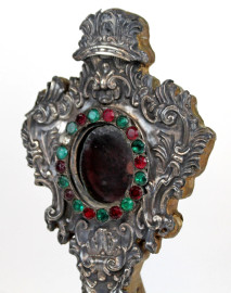 Reliquario del XVIII secolo, in legno rivestito in lamina d'argento sbalzata e cesellata a motivi di rocailles con applicazioni in vetro colorato, cm h 34,5, (difetti).