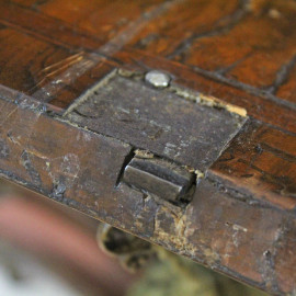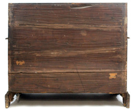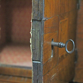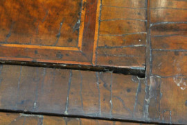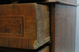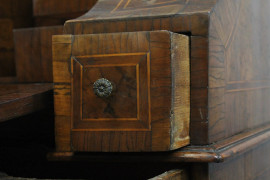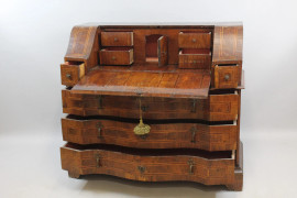 Ribalta veneta del XVIII secolo, in noce e radica con filettatura in bosso, fronte di linea mossa a tre cassetti e due cassettini laterali, uno sportello a ribalta celante cassettini e segreti all'interno, cm h 103x118x55, (difetti).
