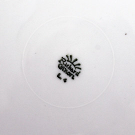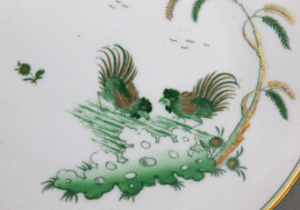 Richard Ginori, lotto di dodici piatti da frutta in porcellana, decoro nei toni del verde e dell'oro raffigurante paesaggio con galli, diam. cm 20