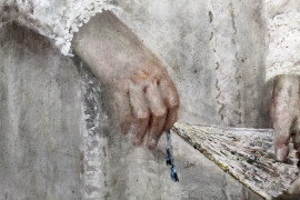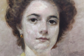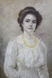 Ritratto di donna con vestito bianco, olio su tela, cm 100,5x60, inizi XX secolo