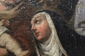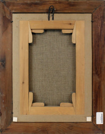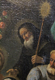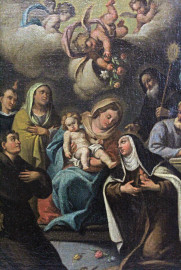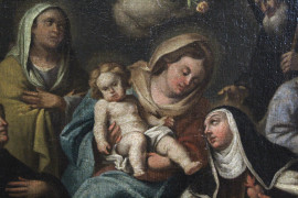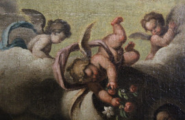 Sacra famiglia con angeli e santi, olio su tela, cm 51,5x37, XVIII secolo, entro cornice.