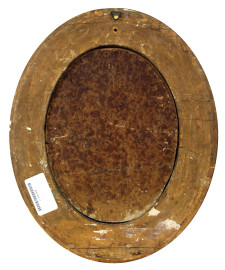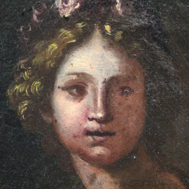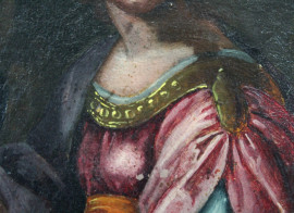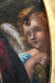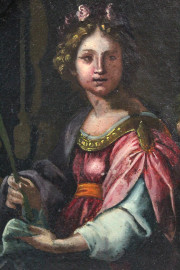 Santa Caterina d'Alessandria con angelo, olio su tela riportata su cartone, cm 26x19,5, inizi XVIII secolo, entro cornice ad assetto ovale.