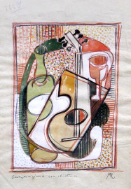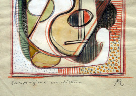 Scomposizione con chitarra, tecnica mista su carta, cm 15x21, titolata e siglata, entro cornice