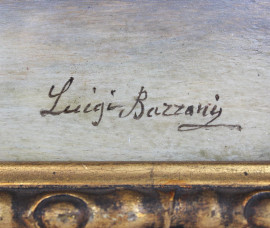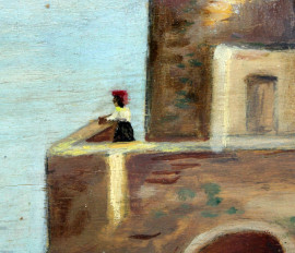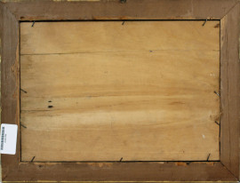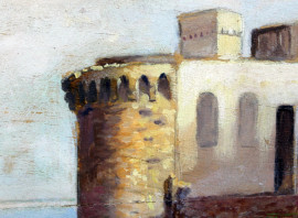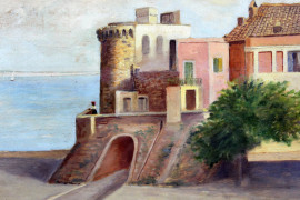Scorcio costiero con castello, olio su tavola, cm 27x38, firmato, entro cornice.