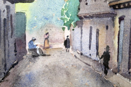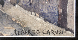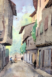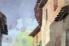 Scorcio di paese laziale, acquarello su carta, cm 27x20, firmato, entro cornice.
